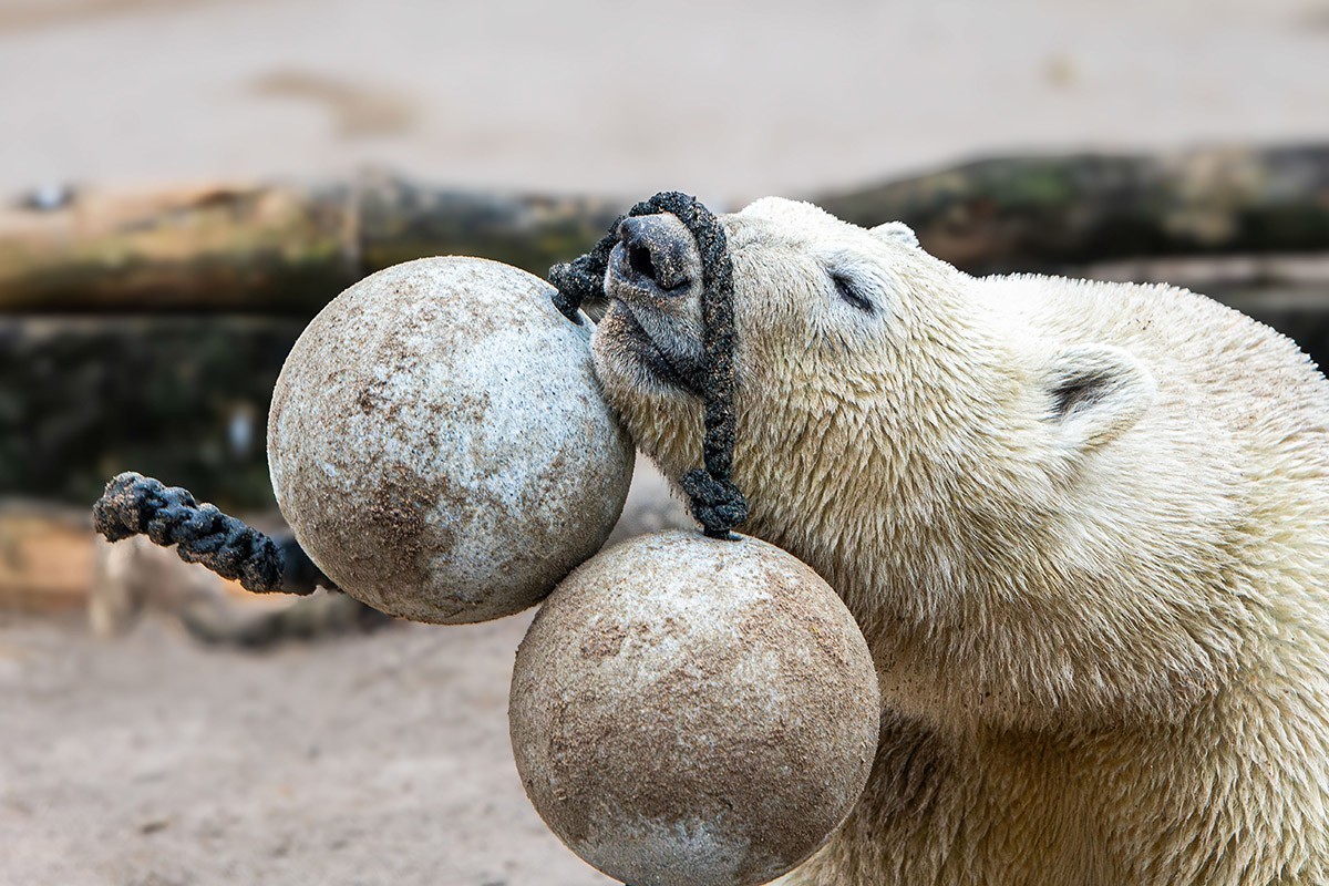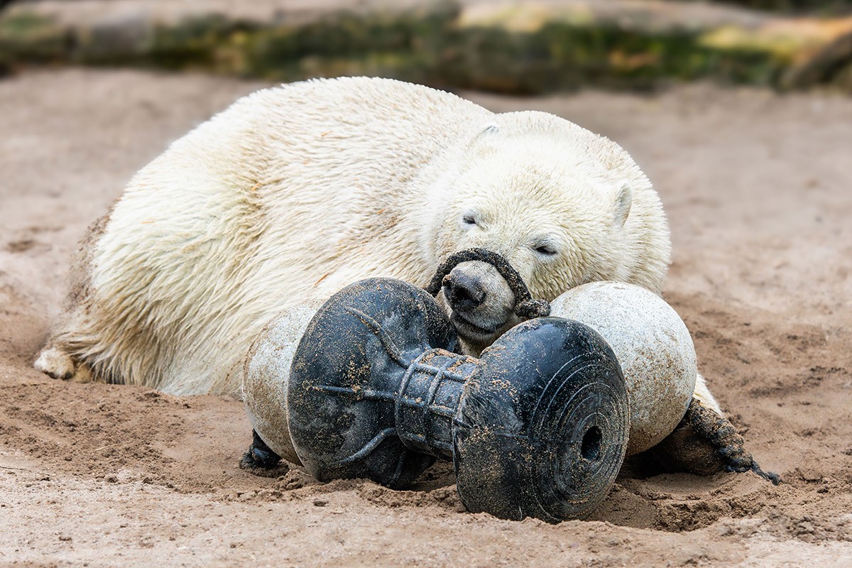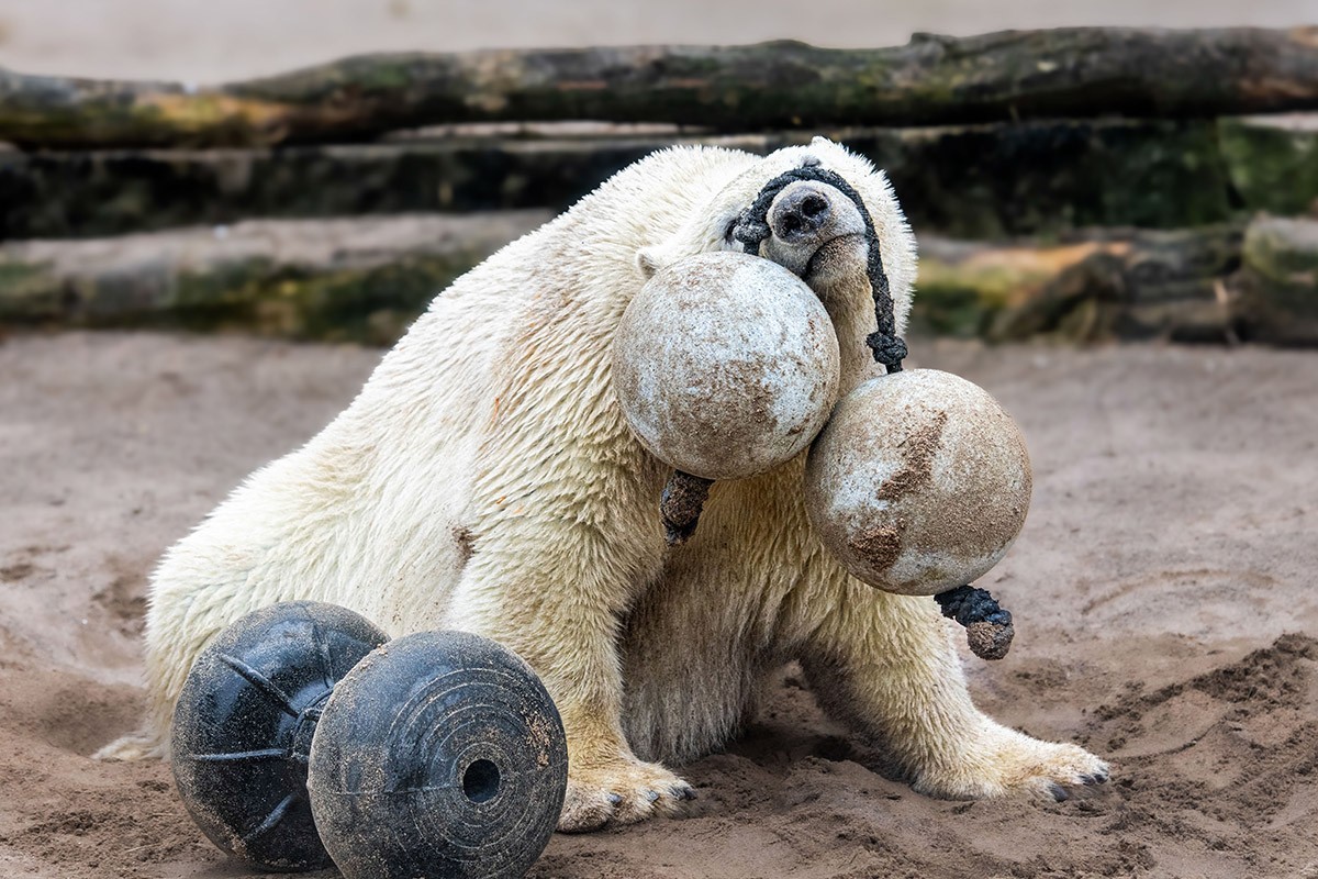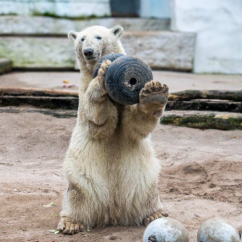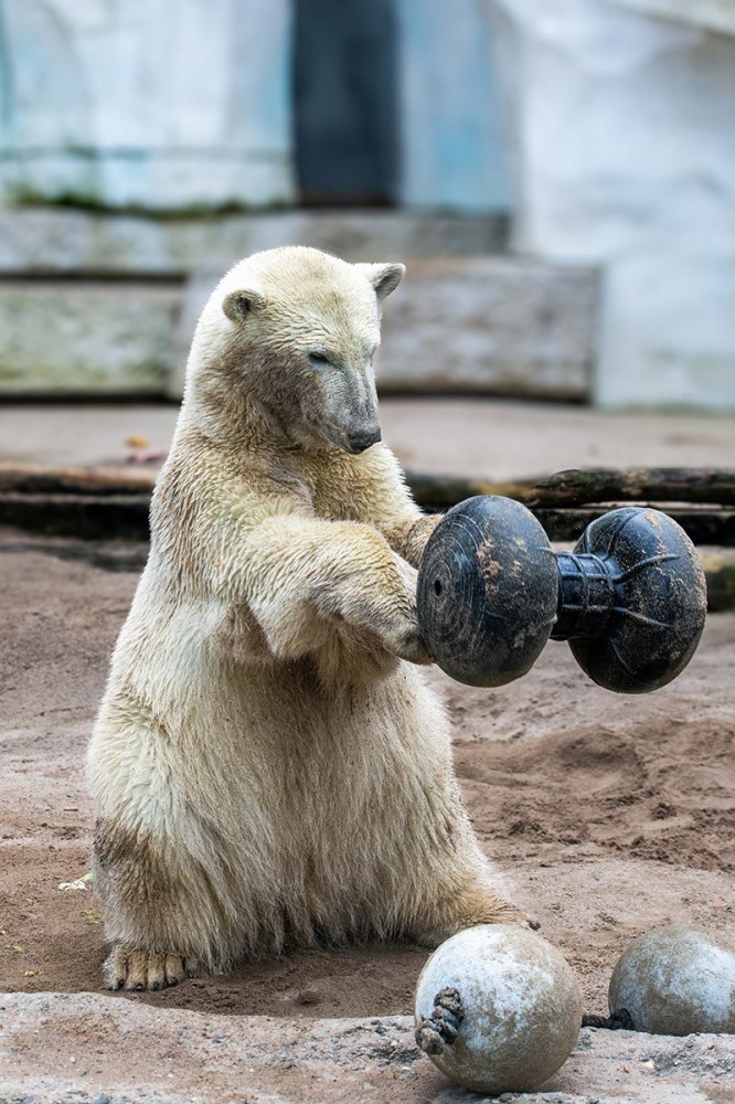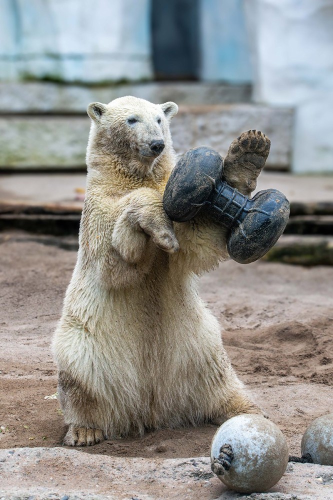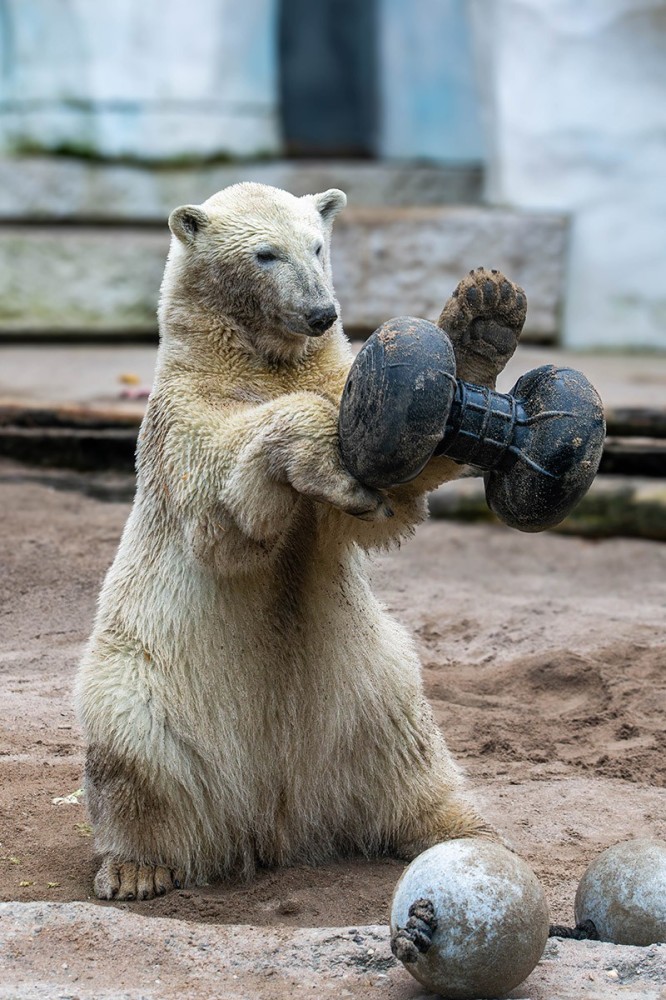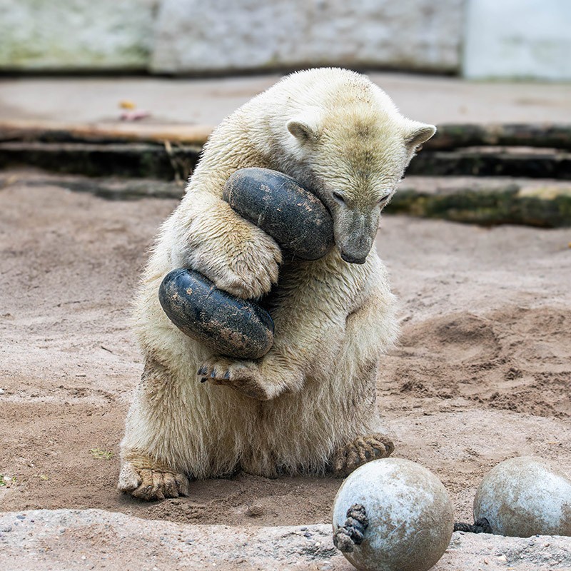 Mika wird immer größer, ist ein richtiger Youngster geworden. Aber er ist immer noch sehr verspielt, was seine Mutter Nuka auch heute noch ist. Zuerst versucht er sich mal wieder an den zwei verbundenen Bällen, dann mit der Hantel. Wenn man ganz schnell durchklickt und auf sein Gesicht blickt, dann man einfach schmunzeln. Viel Spaß!