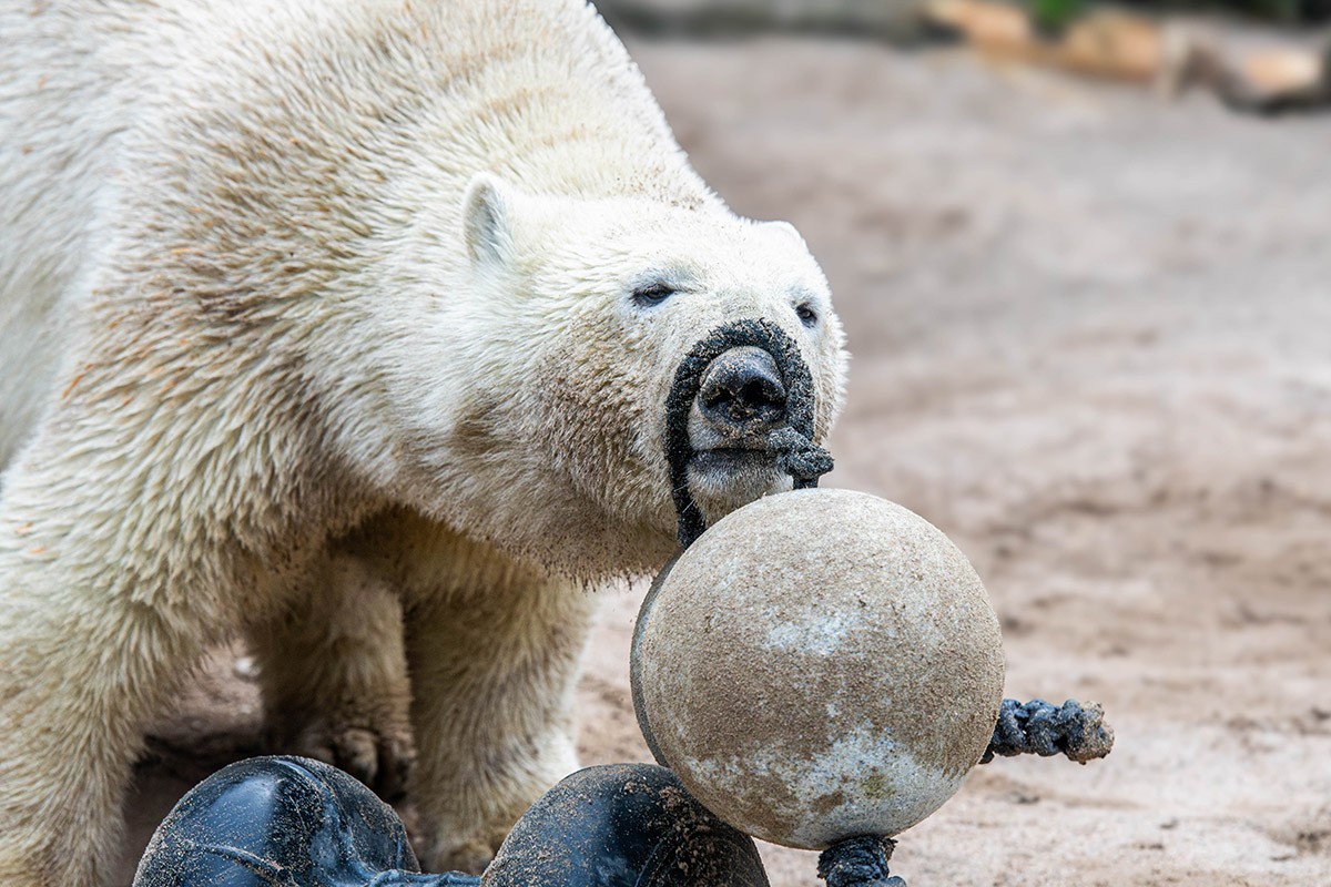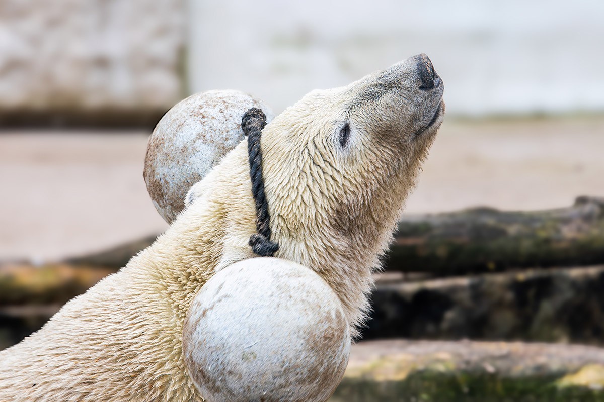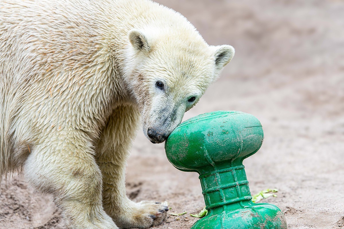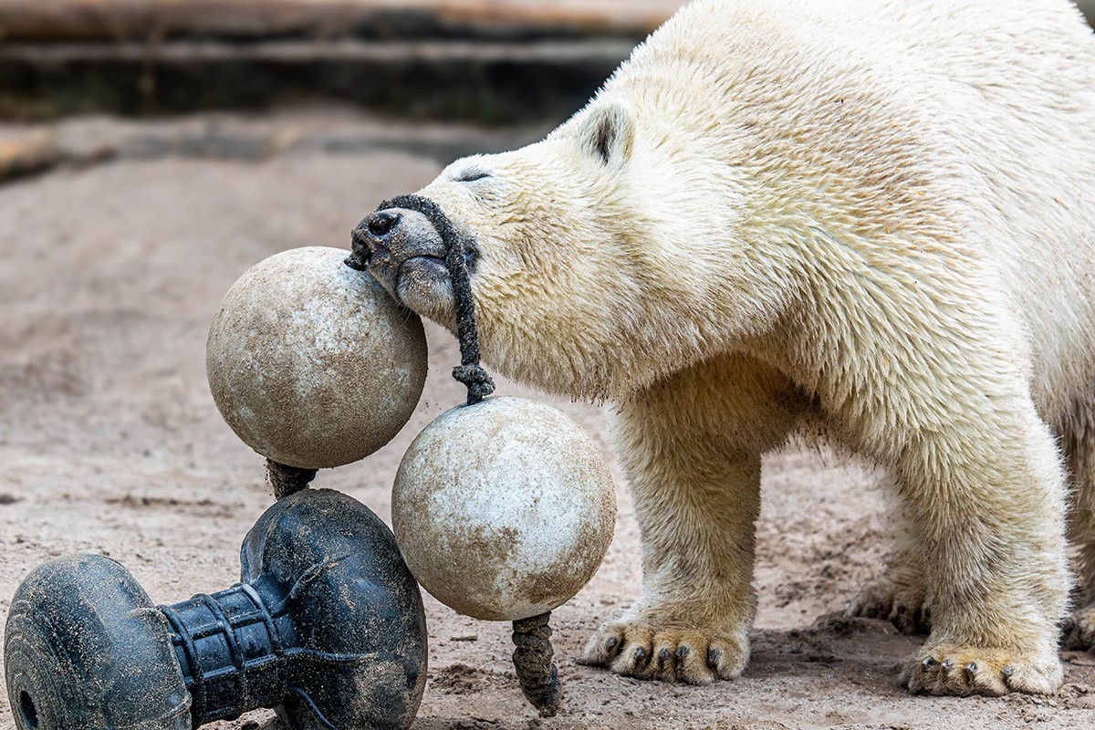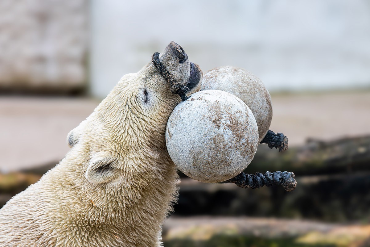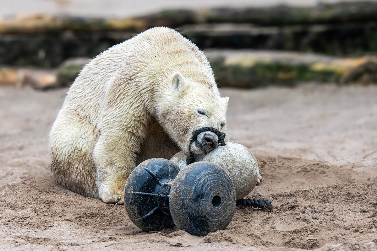 Mika wird immer größer, ist ein richtiger Youngster geworden. Aber er ist immer noch sehr verspielt, was seine Mutter Nuka auch heute noch ist. Zuerst versucht er sich mal wieder an den zwei verbundenen Bällen, dann mit der Hantel. Wenn man ganz schnell durchklickt und auf sein Gesicht blickt, dann man einfach schmunzeln. Viel Spaß!