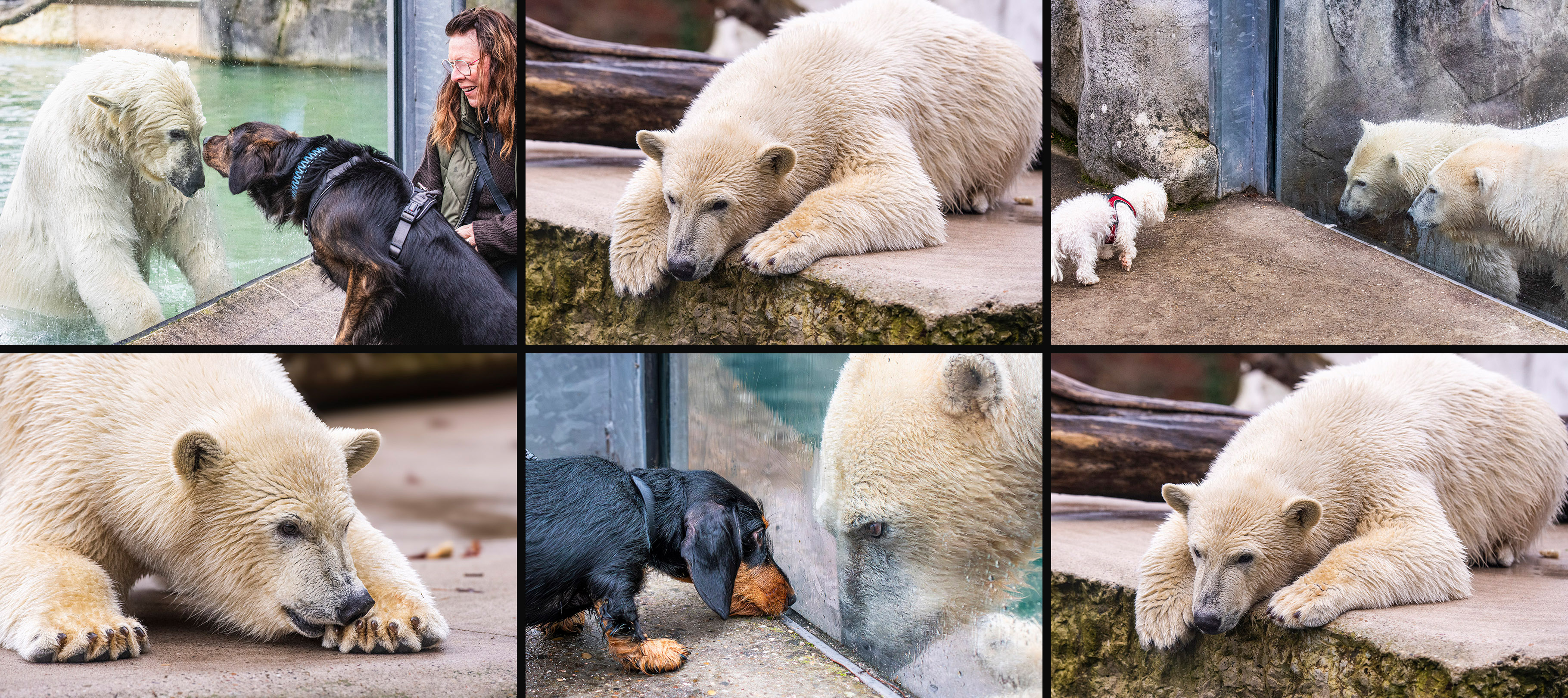 Erstmals dürfen an diesem Wochenende die Besucher ihre Hunde mitbringen. Ein Versuch, bei dem so manche Zoobewohner nicht mehr aus dem Staunen herauskamen. Ganz besonders die Eisbären Nuka und MIka waren doch sehr überrascht! Die Bilder mit der Eisbärin Nuka und dem 6 Monate alten Dackel haben mich am meisten fasziniert, da Nuka sofort merkte, dass es sich um einen Welpen handelte und ihn auf dem letzten Bild sogar ablecken wollte. Viel Spaß