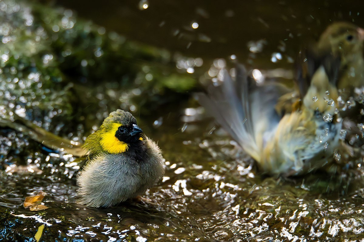 Im Karlsruher Exotenhaus tummeln sich an diesem Ort fließenden Wassers verschiedenste Vogelarten, die hier zum Baden kommen und ausgiebig Gefiederpflege betreiben.
